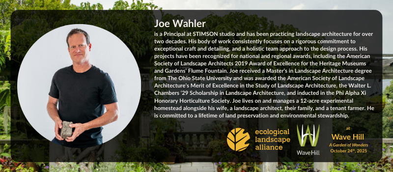 Joe Wahler is a landscape architect and Principal at STIMSON, an urban and rural landscape architecture studio, working farm and plant nursery located in Cambridge and Princeton, Massachusetts. STIMSON values longevity, no waste, education, ecological fluency, community, slowness, and that the design process is just as important as the end project. Joe will share STIMSON’s commitment to a collaborative process and mutualism through a series of recent projects. The Coonamessett Gateway Park and River Restoration in Falmouth, MA, is a 20-year collaboration to restore the Coonamessett River and its community’s connections to the river. Harvard University’s Paulson School of Engineering in Allston, Massachusetts, a 15-year journey to create an integrated high-performance building and landscape that references the function of historic landscapes as a basis for site restoration. Ferrous Foundry Park in Lawrence, Massachusetts, a public park on a brownfield site along the Lawrence River that embraces spontaneous vegetation and its ability to heal a degraded landscape.